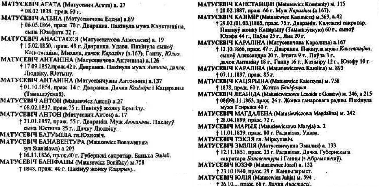 В этом разделе - фрагменты различных списков, баз данных, перечней и таблиц с информацией о Матусевичах. • Список землевладельцев Минской губернии 1861-1900гг. • Список дел о дворянском происхождении Матусевичей, хранящихся в Российском государственном историческом архиве • Список погибших советских воинов в Великой отечественной войне • Книги Памяти Архангельской и Ленинградской областей • Список репрессированных в СССР польских граждан • Список иммигрировавших в США в начале XX века • Матусевичи в Израиле • Список Матусевичей, погибших в Борисовском гетто в октябре 1941 года • Список Матусевичей, репрессированных после восстания 1863-1864 гг. под предводительством К. Калиновского • Список дворян Минской Губернии, давшим в 1863 году полномочие на подписание "всеподданейшего письма на имя Государя Императора" • Фрагмент ревизских сказок за 1795 год по Минскому уезду Минской губернии, в которых встречаются Матусевичи • Фрагмент ревизских сказок минских мещан за 1850 год, в которых встречаются Матусевичи • Список Матусевичей, похороненных в 1836-1899 гг. на Кальварийском кладбище в Минске • Список Матусевичей – жертв Холокоста • Архивы Арользена - списки жертв национал-социализма • и другое Список Матусевичей - землевладельцев Минской губернии 1861-1900гг.